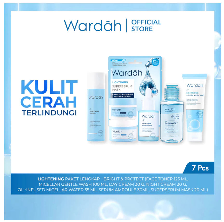 Wardah Lightening Paket Lengkap - Bright & Protect (Serum Ampoule, Night Cream, Face Toner, Day Cream, Facial Wash, Sheet Mask