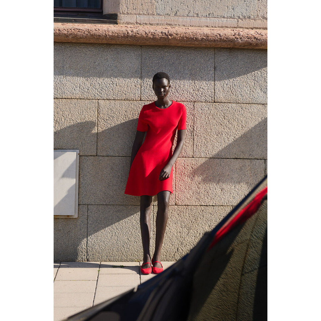 Short, fitted dress in a dense knit with a round, rib-trimmed neckline, short sleeves and a flared skirt.