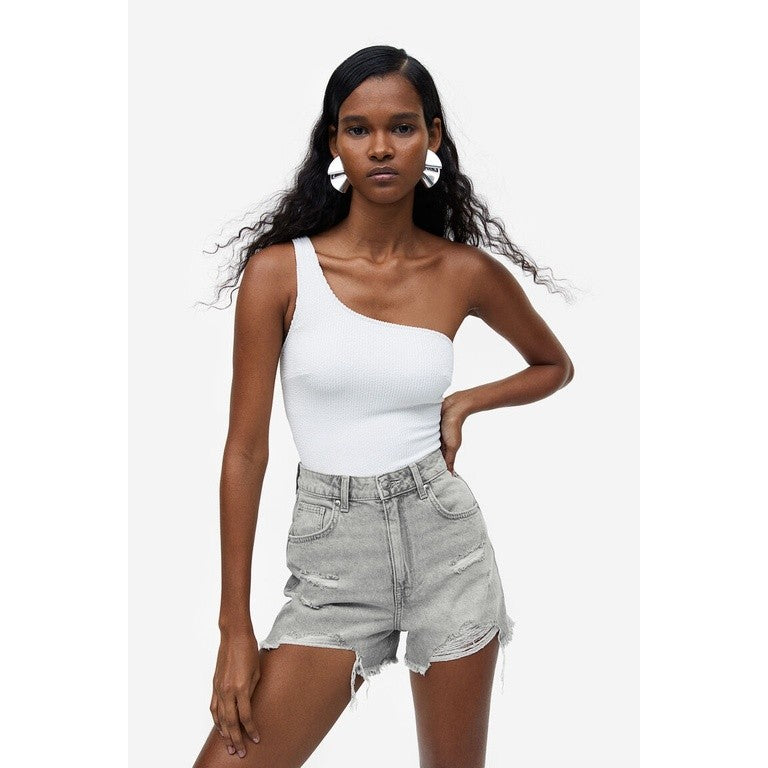 Short, fitted, one-shoulder dress in soft jersey with an asymmetric neckline. Gathered seams on the shoulders and at one side...