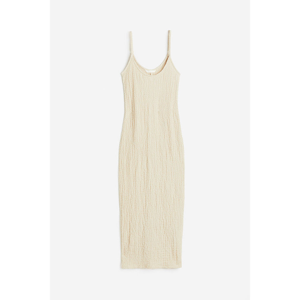 Calf-length, fitted dress in crinkled jersey in a sleeveless design with narrow, adjustable shoulder straps. Care Instruction : Can be...