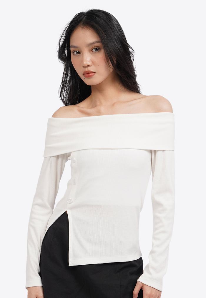 - Atasan Lengan Panjang - Off Shoulder - Side Slit With Button Details - Textured Fabric - Regular - Material:...