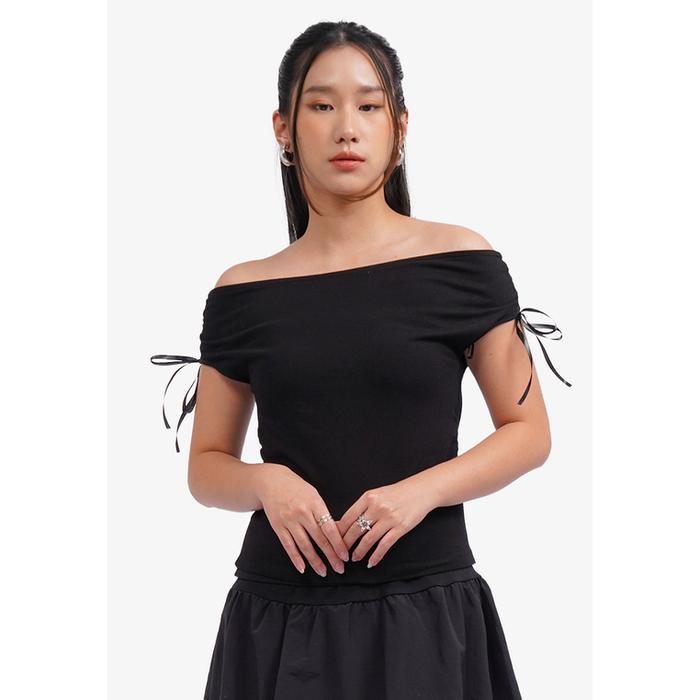 - Atasan Lengan Pendek - Off Shoulder - Ribbon Details On Sleeve - Stretch Fabric - Fitted Crop - Material:...