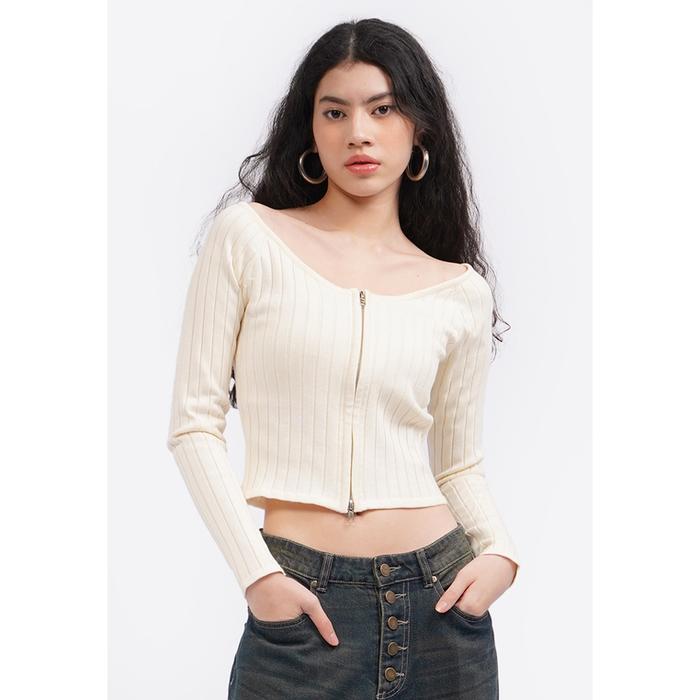 - Atasan Lengan Panjang - Off Shoulder - Front Zipper Opening - Textured Fabric - Fitted Crop - Material: Flat...