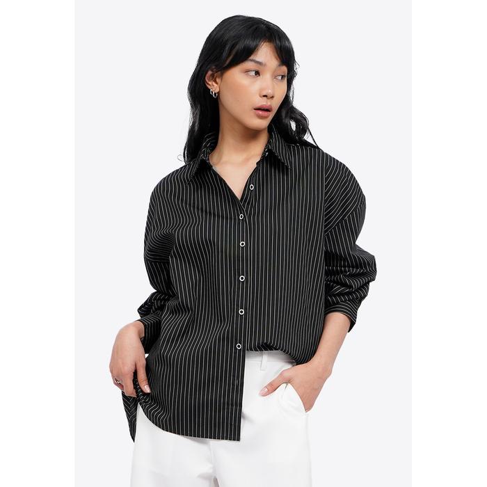 - Kemeja Lengan Panjang - Pinstripes Fabric - Drop Shoulder Details - Contrast Front Button Opening - Oversized Medium -...