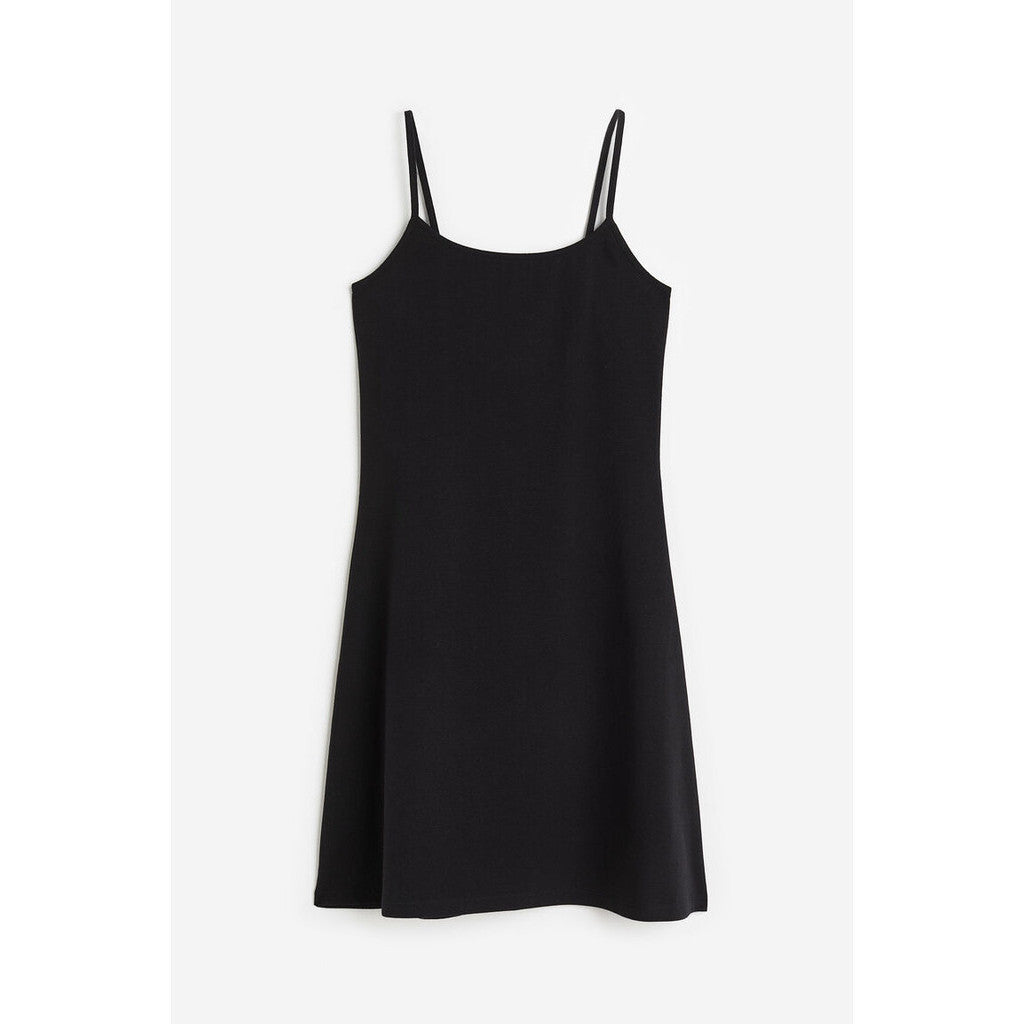 Short dress in soft cotton jersey with a deep, round neckline, narrow shoulder straps, a fitted bodice and a gently...