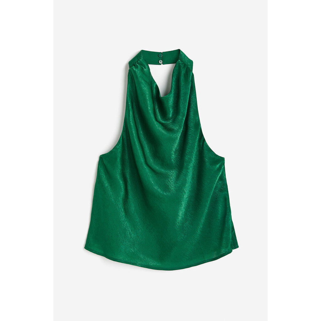 Short halterneck top in softly draping satin with a cowl neckline and concealed buttons at the back of the neck....