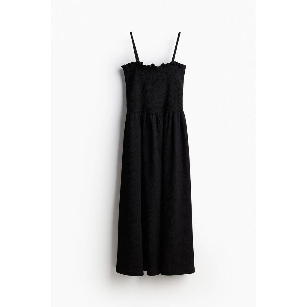 Knee-length, sleeveless dress in textured jersey with narrow, adjustable shoulder straps, a smocked, frill-trimmed bodice and a gently flared skirt....