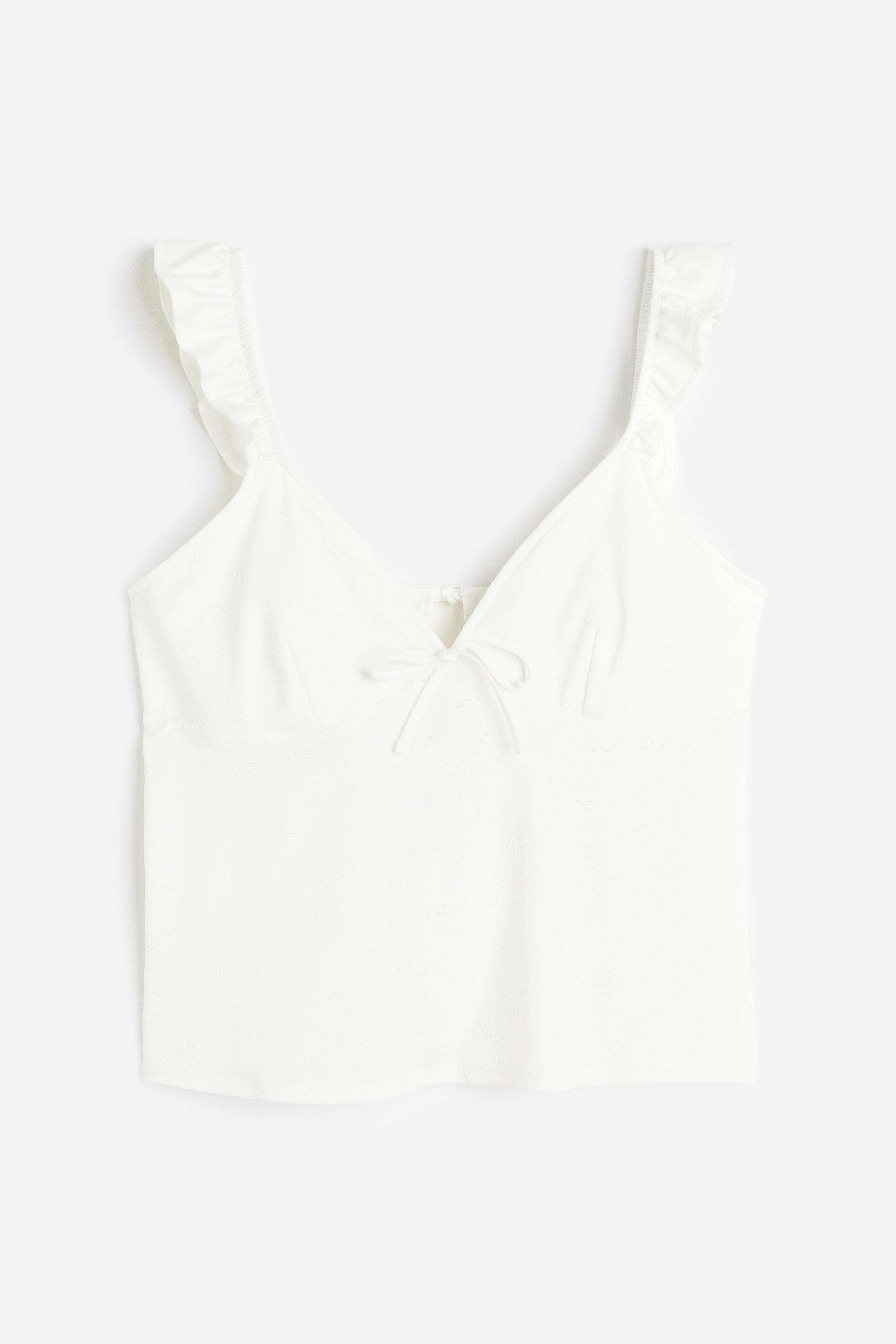 Short, fitted jersey top with a V-shaped neckline at the front and frill-trimmed shoulder straps. Shaped cups, decorative ties at...