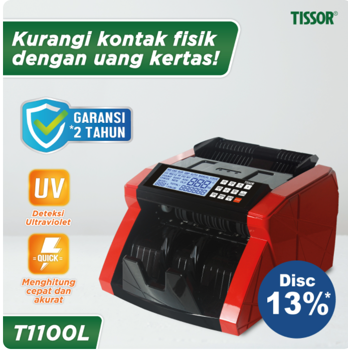 Deskripsi Tissor T1100L Mesin Penghitung Uang - Alat Hitung Uang Money CounterSpesifikasi T1100L :1. Kecepatan hitung > 1000 lembar/menit2. Berat...