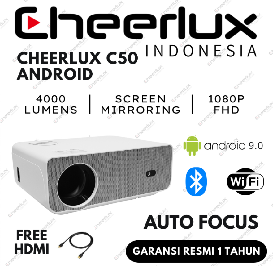 CHEERLUX LED PROJECTOR C50 ANDROID NEW VERSION WITH AUTO FOCUS Fitur: 1. Speaker Stereo HiFi, Resolusi Asli 1920x1080. 2. Fungsi...