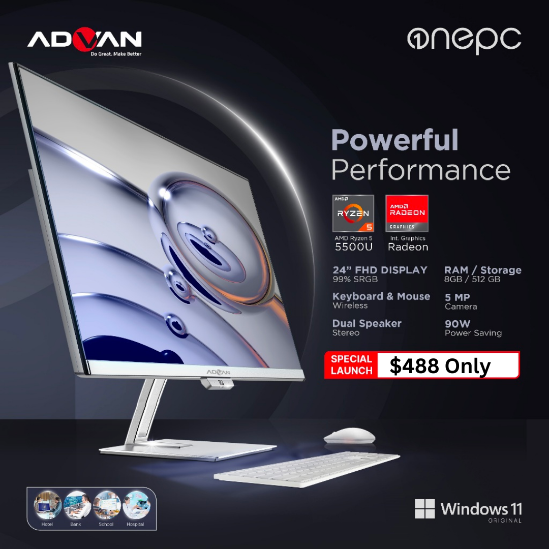ADVAN kembali menghadirkan product All In One PC dengan desain yang lebih compact, tipis, dan elegan. Didesain dengan dominasi warna silver membuat Advan OnePC terlihat semakin modern dan mewah. All In One PC cocok untuk perusahaan yang membutuhkan desktop PC yang hemat tempat dan hemat listrik (bisa di gunakan untuk Costumer service, Staff office, resepsionis, dll). All In One PC juga bisa memenuhi kebutuhan untuk mahasiswa & conten creator, terutama untuk kebutuhan editing foto, video, dan gaming