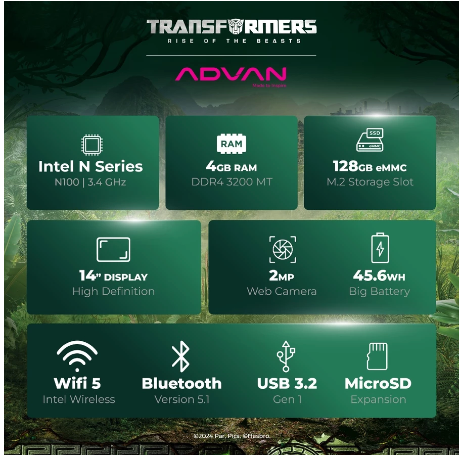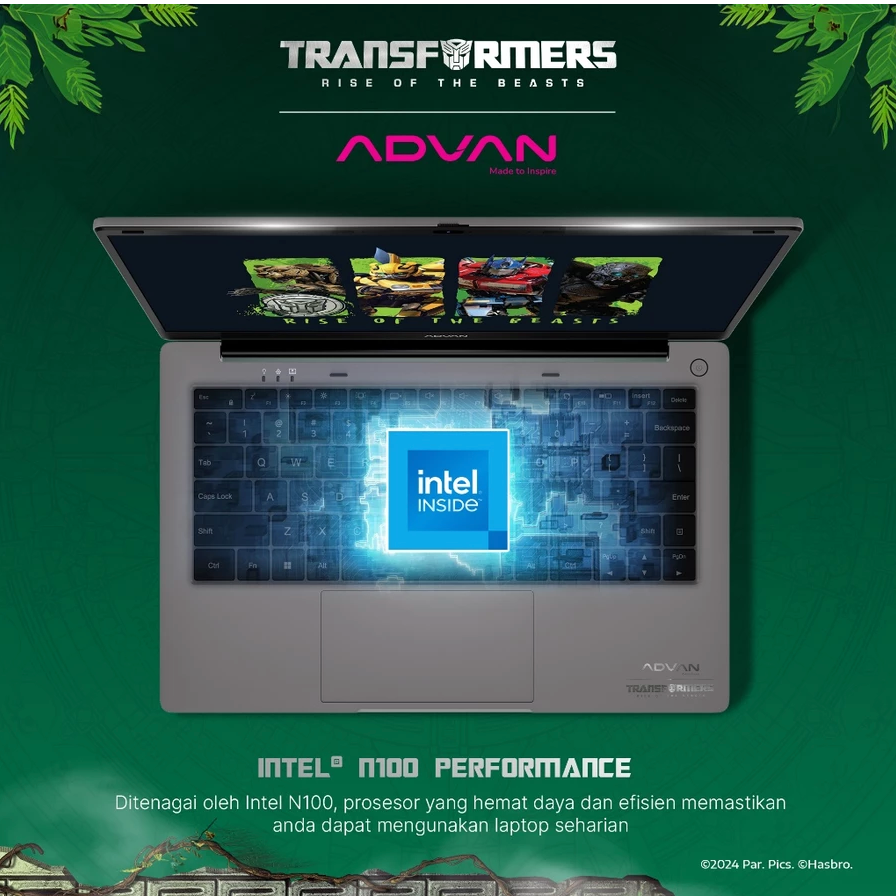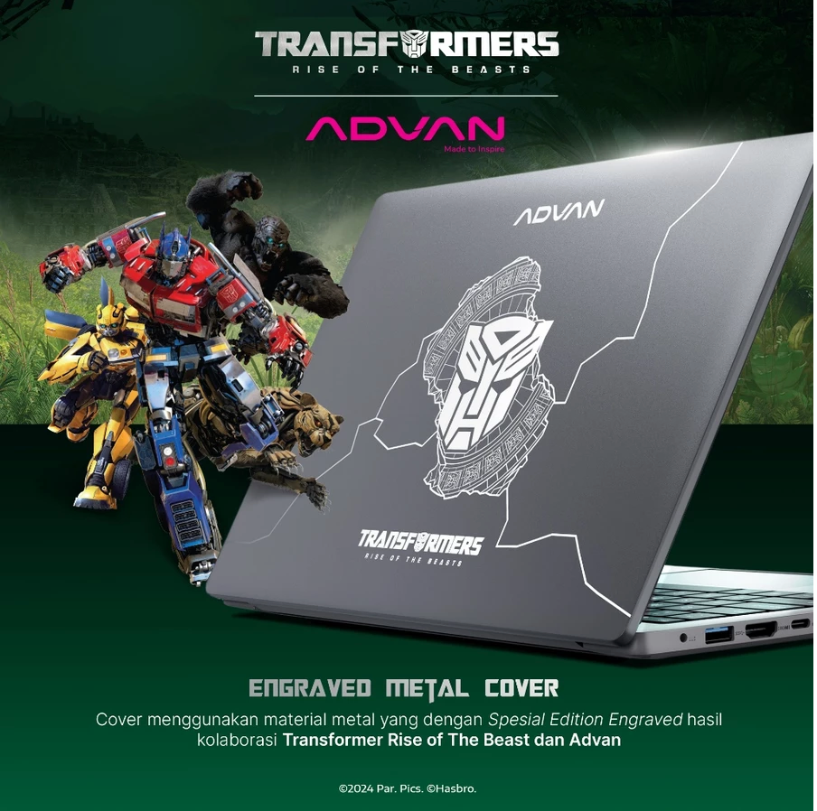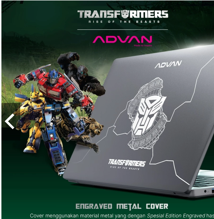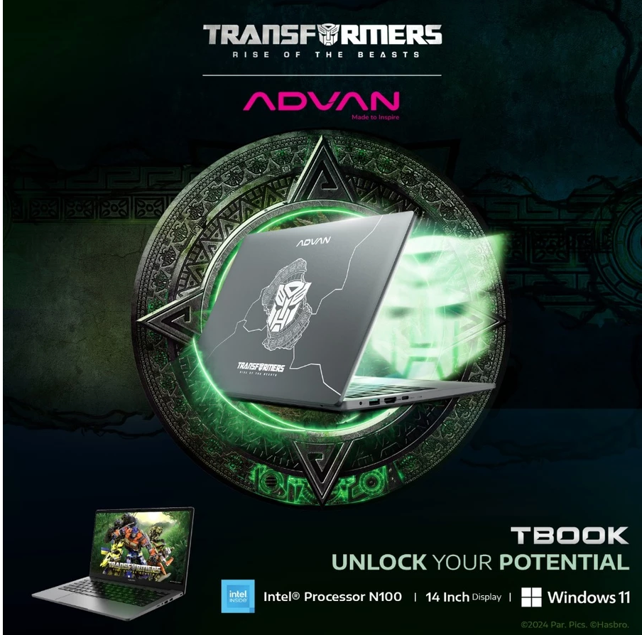 Advan kembali hadir dengan laptop terbaru ADVAN T-BOOK yang berkolaborasi dengan Transformers. Memiliki desain yang minimalis dan kekinian dengan tambahan desain Transformer pada bagian body laptop. Laptop ini ditenagai prosesor Intel N100 yang dapat memenuhi kebutuhan pengguna dalam mendukung produktifitas sehari-hari.