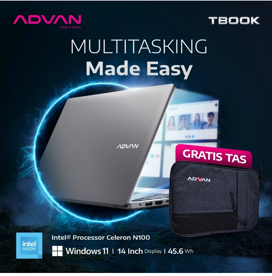 Advan Laptop TBook dapat mendukung produktifitas sehari-hari seperti melakukan pekerjaan pengolahan data, pengerjaan tugas, meeting, dan lainnya. Cocok digunakan untuk pelajar ataupun pekerja untuk menemani produktifitas sehari-hari.