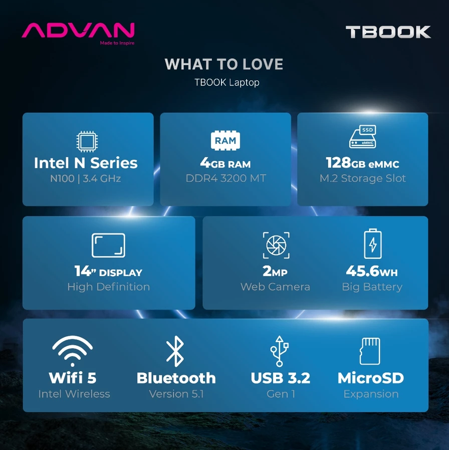 ADVAN T-BOOK Memiliki desain yang minimalis dan kekinian. Laptop ini ditenagai prosesor Intel N100 yang dapat memenuhi kebutuhan pengguna dalam mendukung produktifitas sehari-hari.