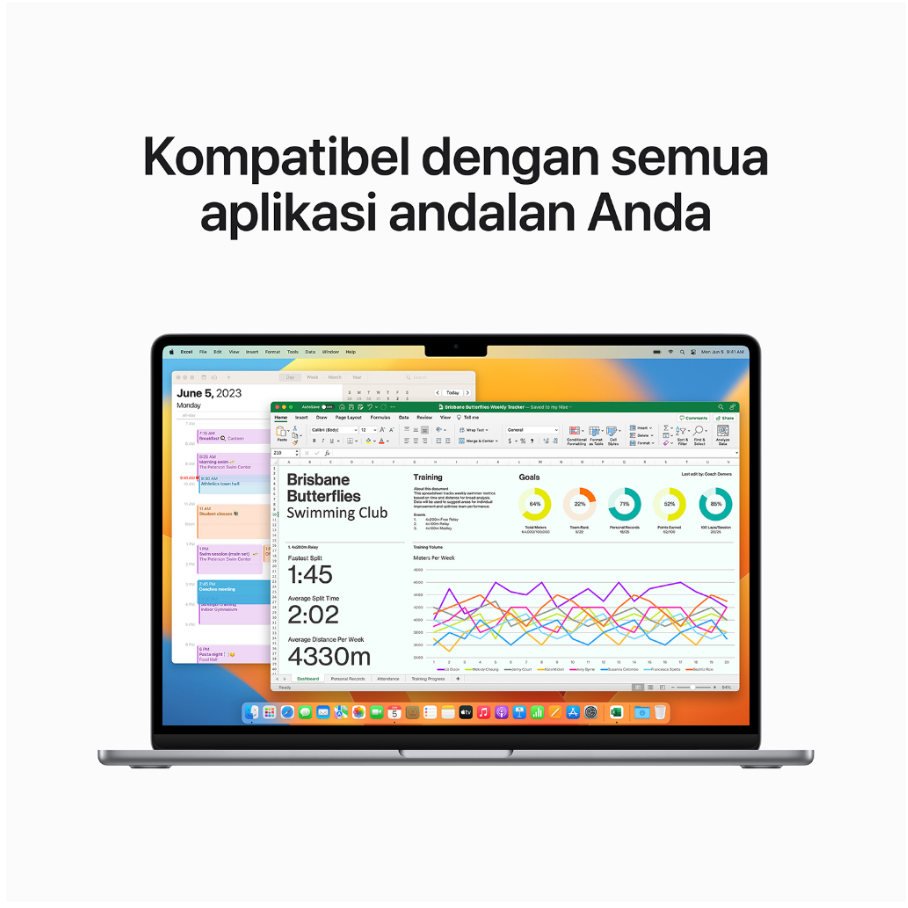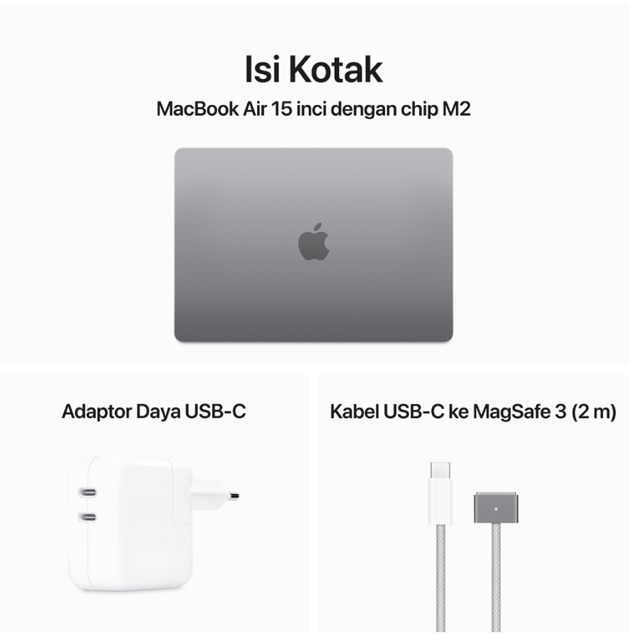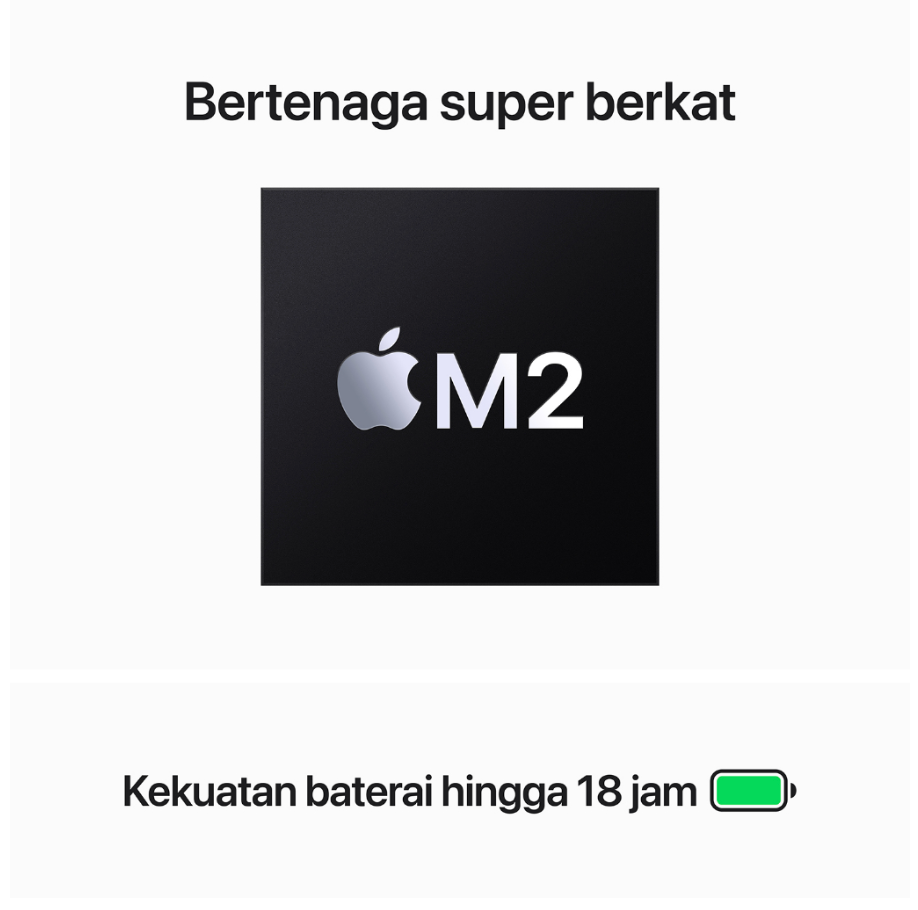 MacBook Air 15 inci luar biasa tipis dan dilengkapi layar Liquid Retina yang memukau. Bertenaga super berkat chip M2 — dan dengan kekuatan baterai hingga 18 jam (1) — MacBook Air ini menghadirkan performa luar biasa dalam desain yang ultra portabel.