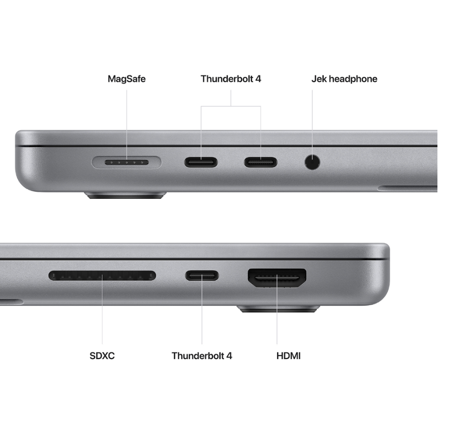 · Tiga port Thunderbolt 4, port HDMI, slot kartu SDXC, jek headphone, port pengisian daya MagSafe