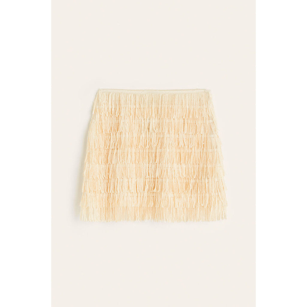 Short, fitted skirt in mesh with flowing, sequined fringes. Regular waist with concealed elastication and a concealed zip at one side. Jersey lining.