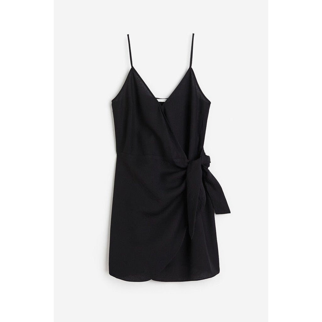 Short dress in woven fabric made from a viscose blend. V-shaped neckline, narrow, adjustable shoulder straps and a wrapover front with wide ties at one side. Elasticated seam at the back of the waist. Unlined.