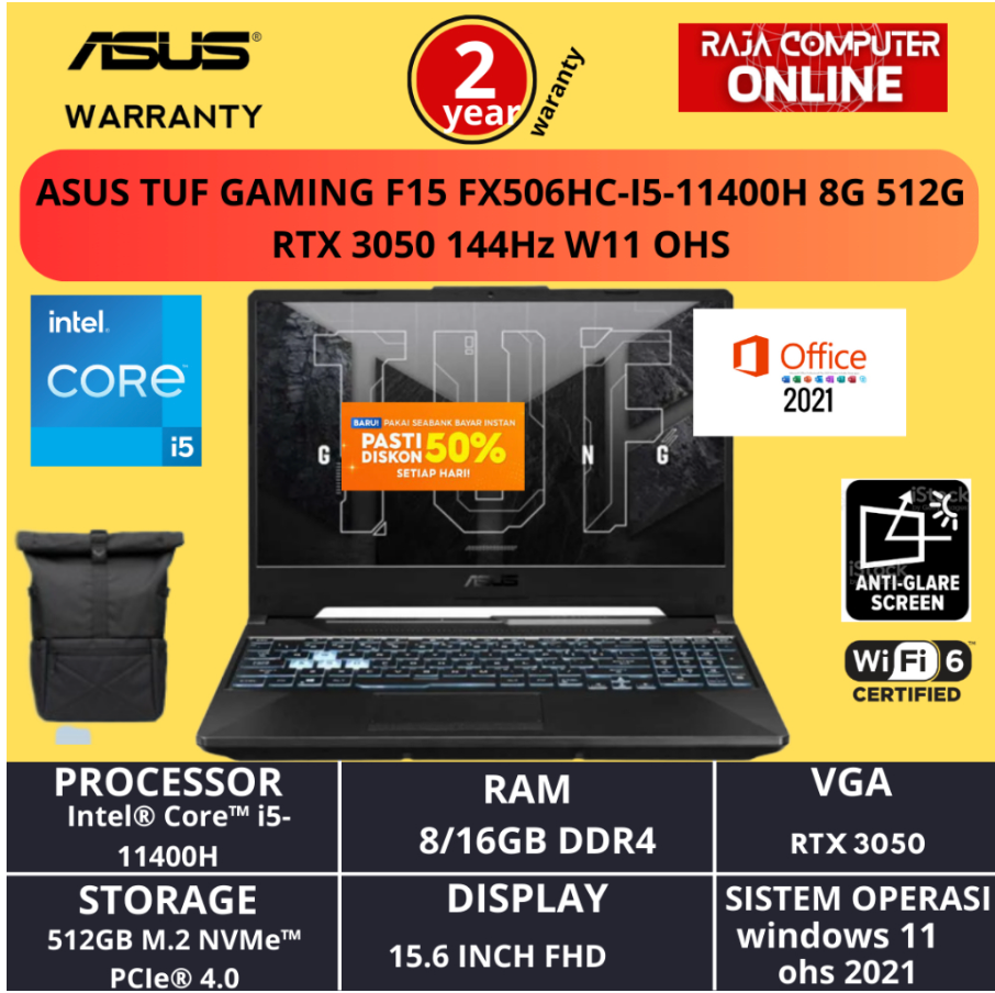Laptop ASUS TUF GAMING F15 FX506HC-I5-11400H 8 512G RTX 3050 144Hz W11 OHS resmi