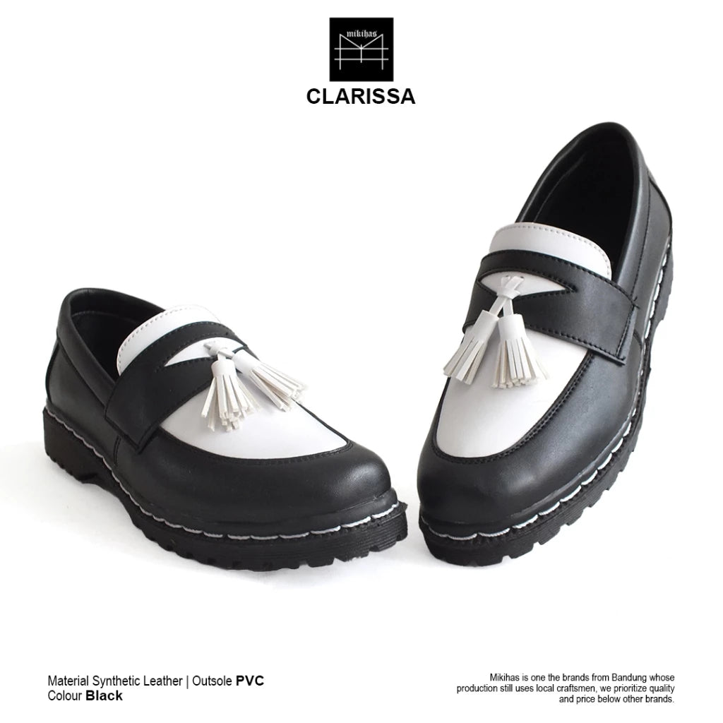 Mikihas Claris - Sepatu Loafers Wanita Kulit Hitam Putih Slip On Kasual - Sol PVC Hitam Ringan