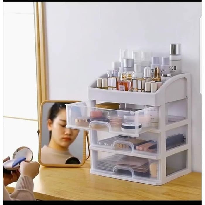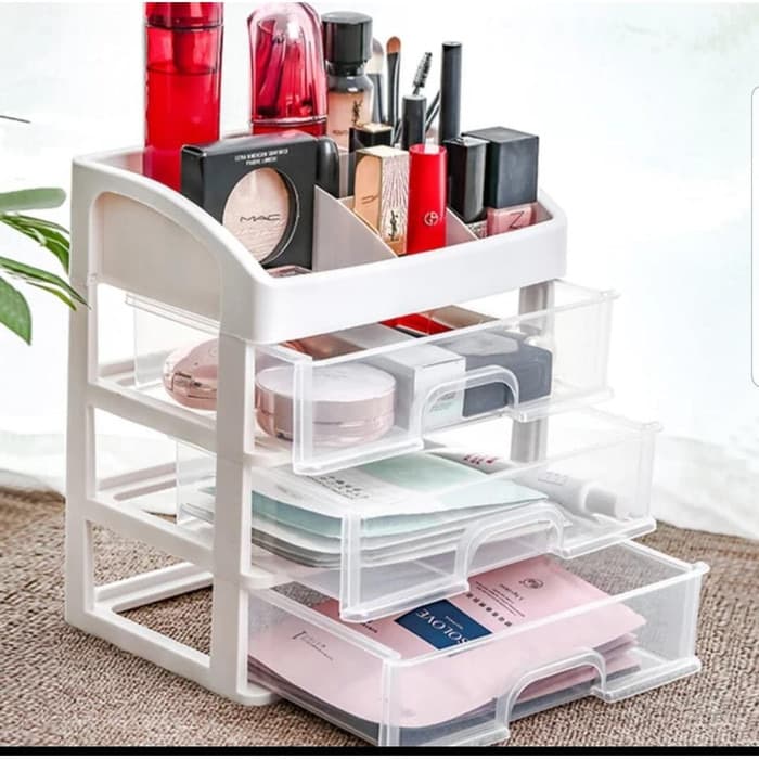Ukuran : -+ 17x23,3x26,8 Bagi Anda para wanita tentu tak bisa dipisahkan dengan produk kosmetika yang menemani hari-hari Anda untuk tampil cantik menarik. Nah, terkadang produk-produk kosmetik serta alat-alat make up terlihat bertebaran begitu saja di atas meja rias. terlihat berantakan dan tidak nyaman dilihat. Nah, untuk mengatasinya Anda bisa mencari tempat penyimpan kosmetik untuk menata produk kosmetik Anda agar terlihat rapi, yakni rak alat make up. Rak kosmetik ini terbuat dari bahan dasar plastik yang memiliki banyak laci dan sekat. Jadi Anda bisa memisahkan berbagai produk kosmetik sesuai keinginan. Misalnya produk untuk perawatan muka, produk untuk perawatan badan, produk untuk perawatan rambut, dan sebagainya.