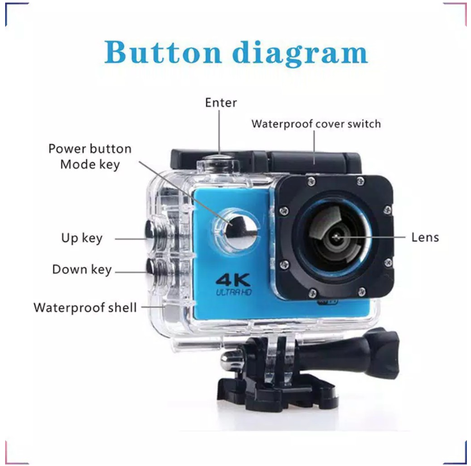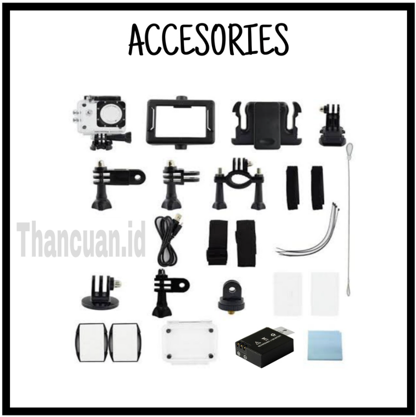 - Accessories : Fit Photo Product *Isi Paket ( Kamera + aksesoris ) 1x Sports Camera wifi 4k ultra HD 1x Waterproof Case 1x Waterproof Case Bracket 1x Waterproof Case Clip 1x Bike Bracket 1x Multifunction Clip 1x Camera Clip 1x Helmet Seat 1x Bandages 1x Cleaning Cloth 1x 3M Stickers 1x USB Cable 1x Bracket Adapter 1x Manual